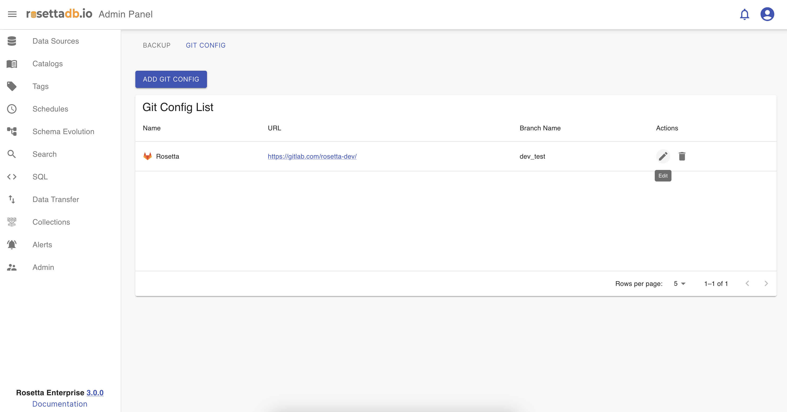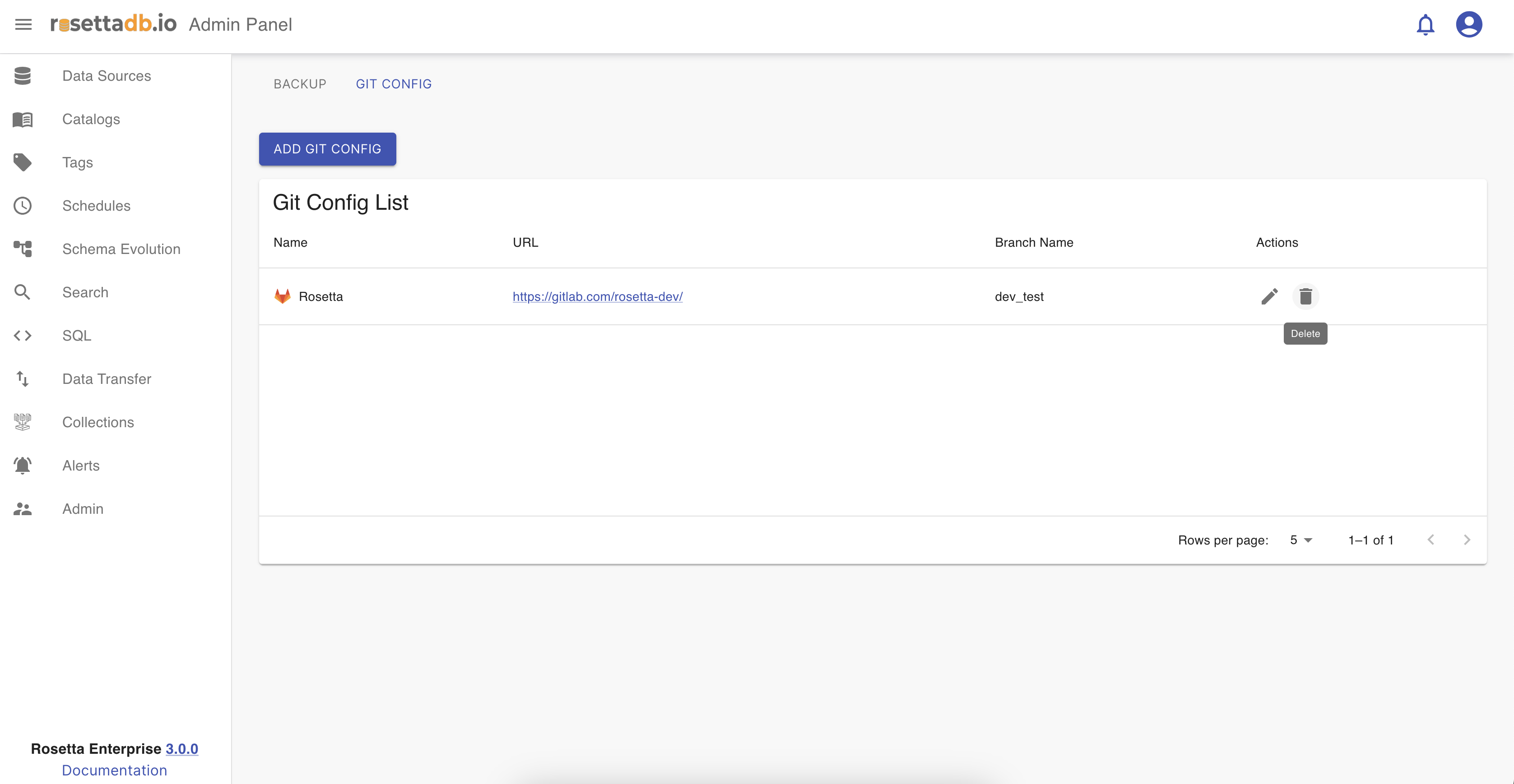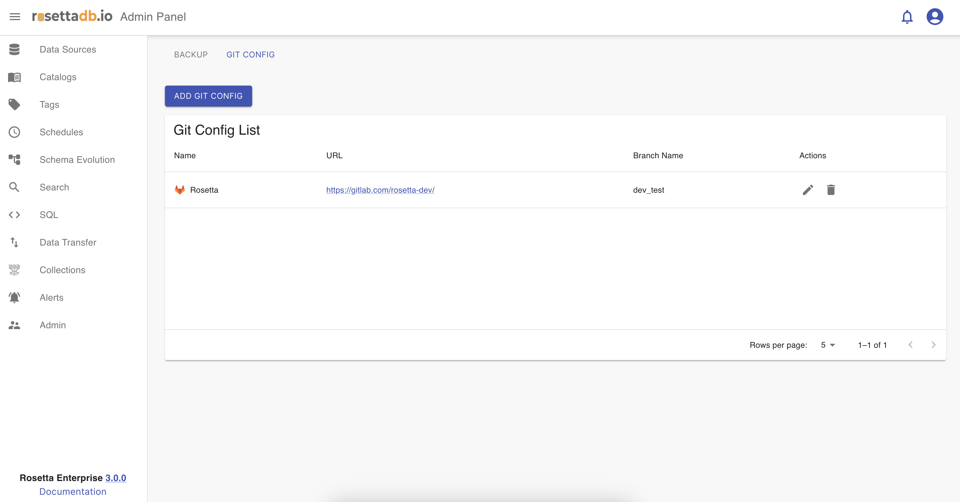 Now that one git is configured, on Git Config tab the user can see a list of the git configurations and a button Add Git Config that redirects to the Git Configuration screen for creating a new configuration. The configuration can be edited and deleted.
