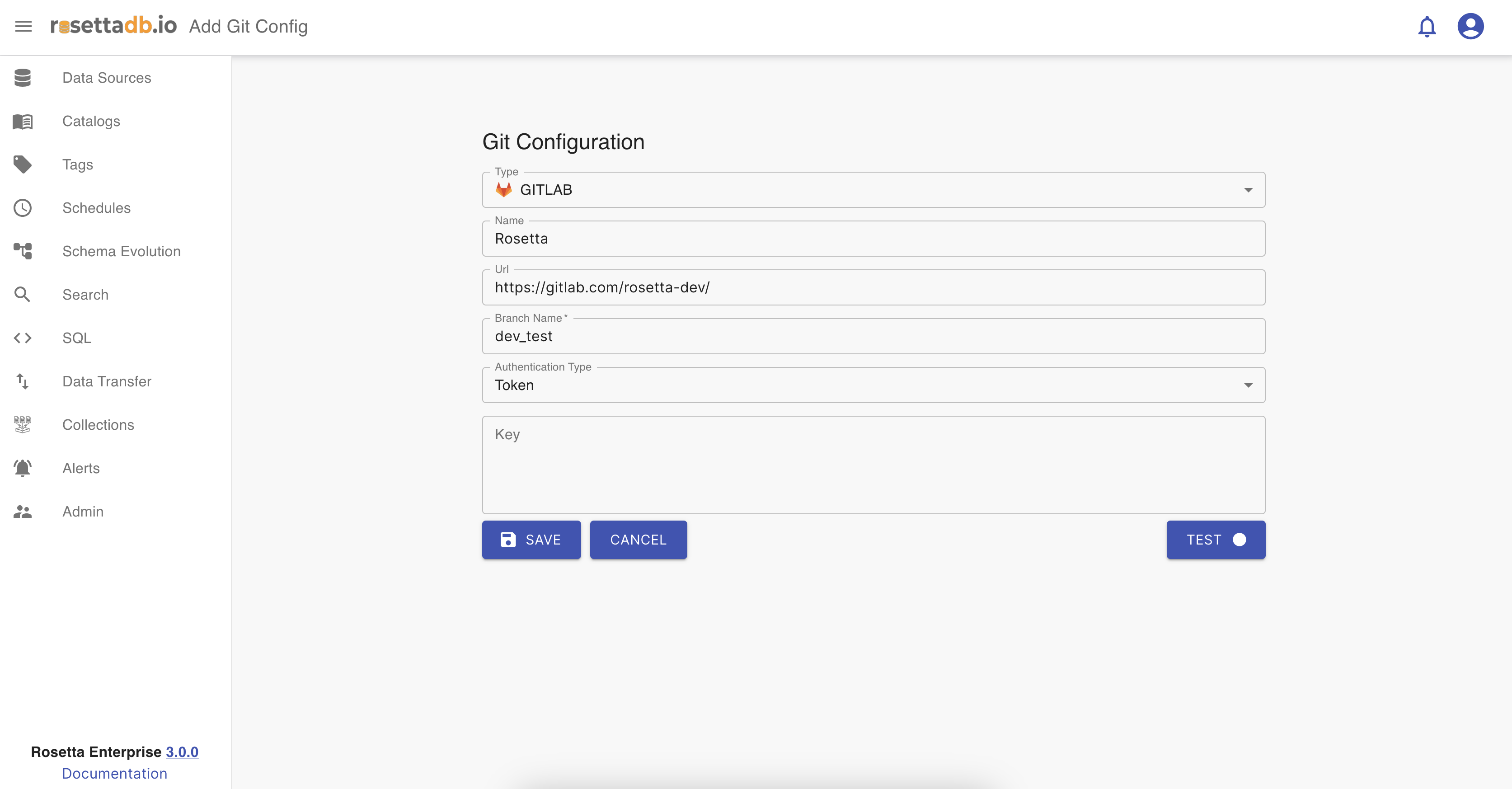 In Git Configuration the user must choose a type of the git such as GitHub, Gitlab, or Bitbucket, fill the name that should be unique, add the url, insert the branch name and provide the authentication key.