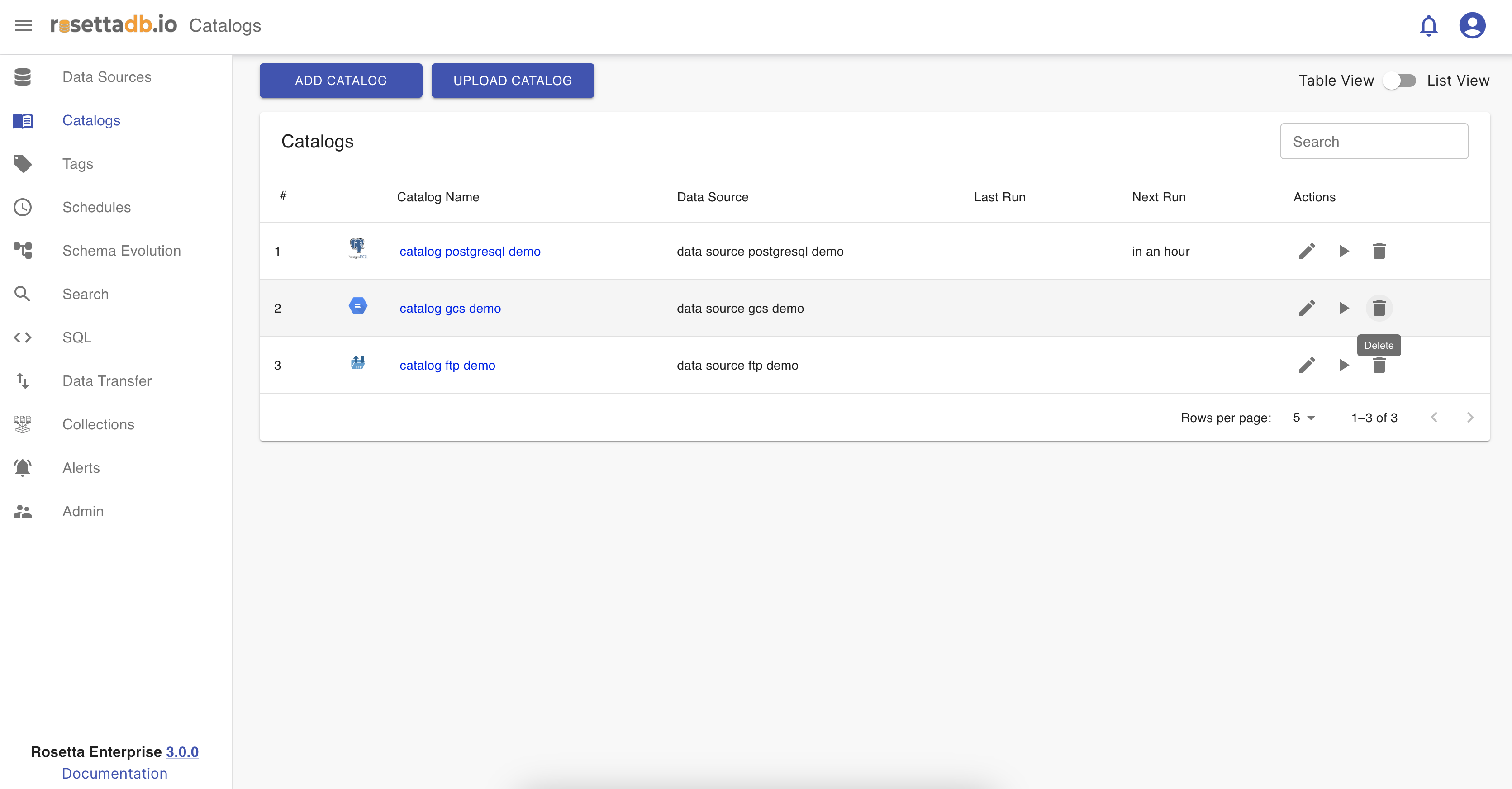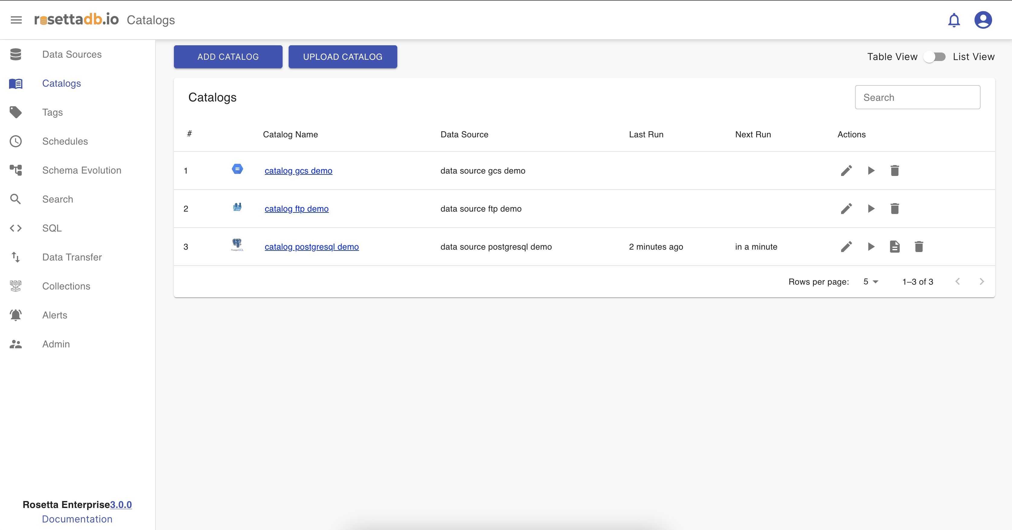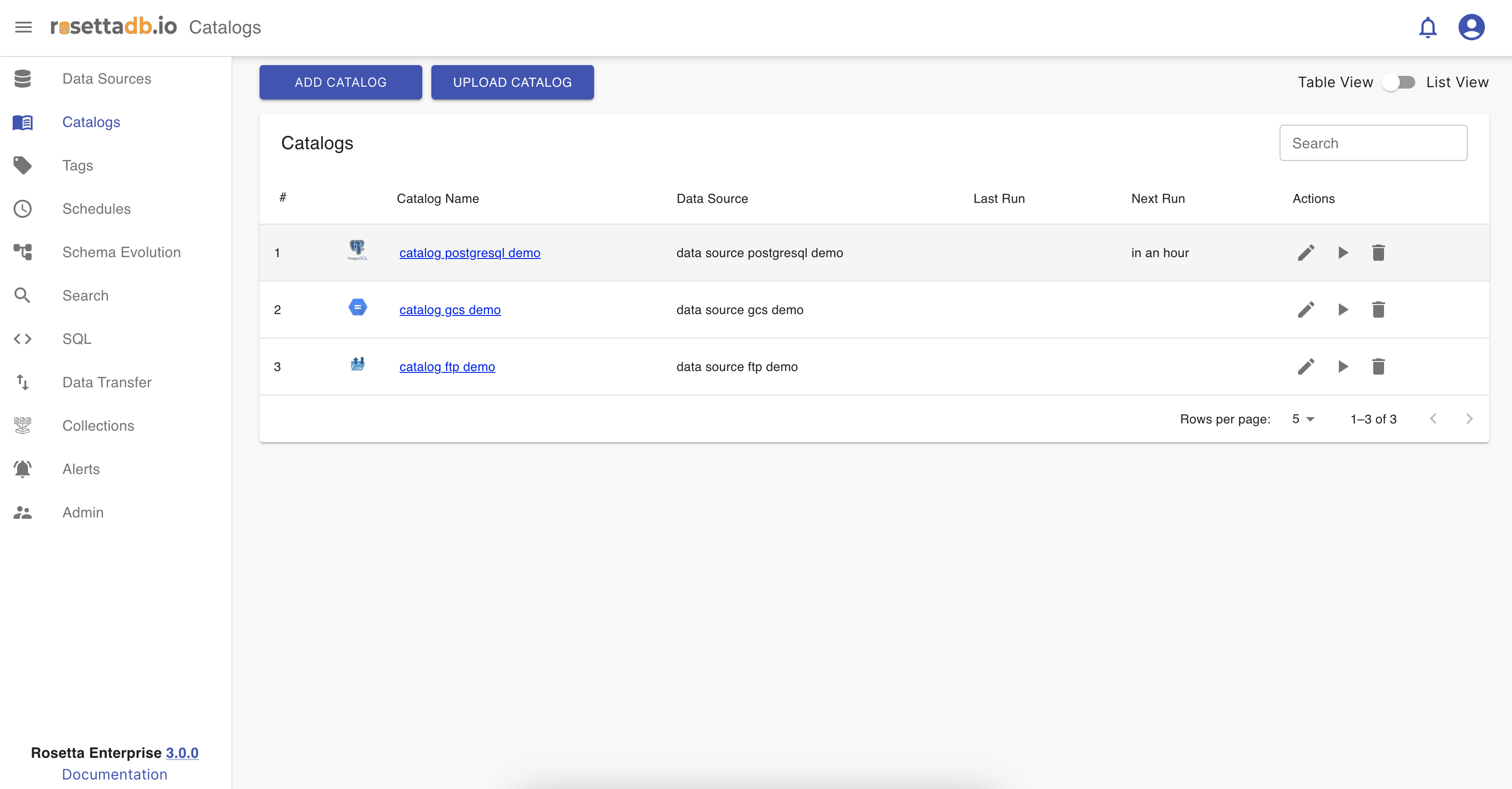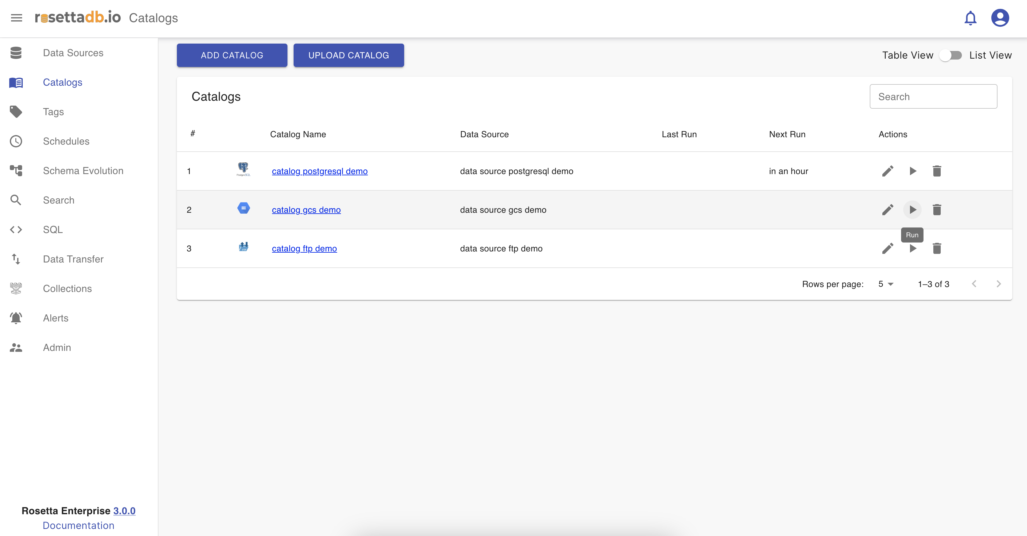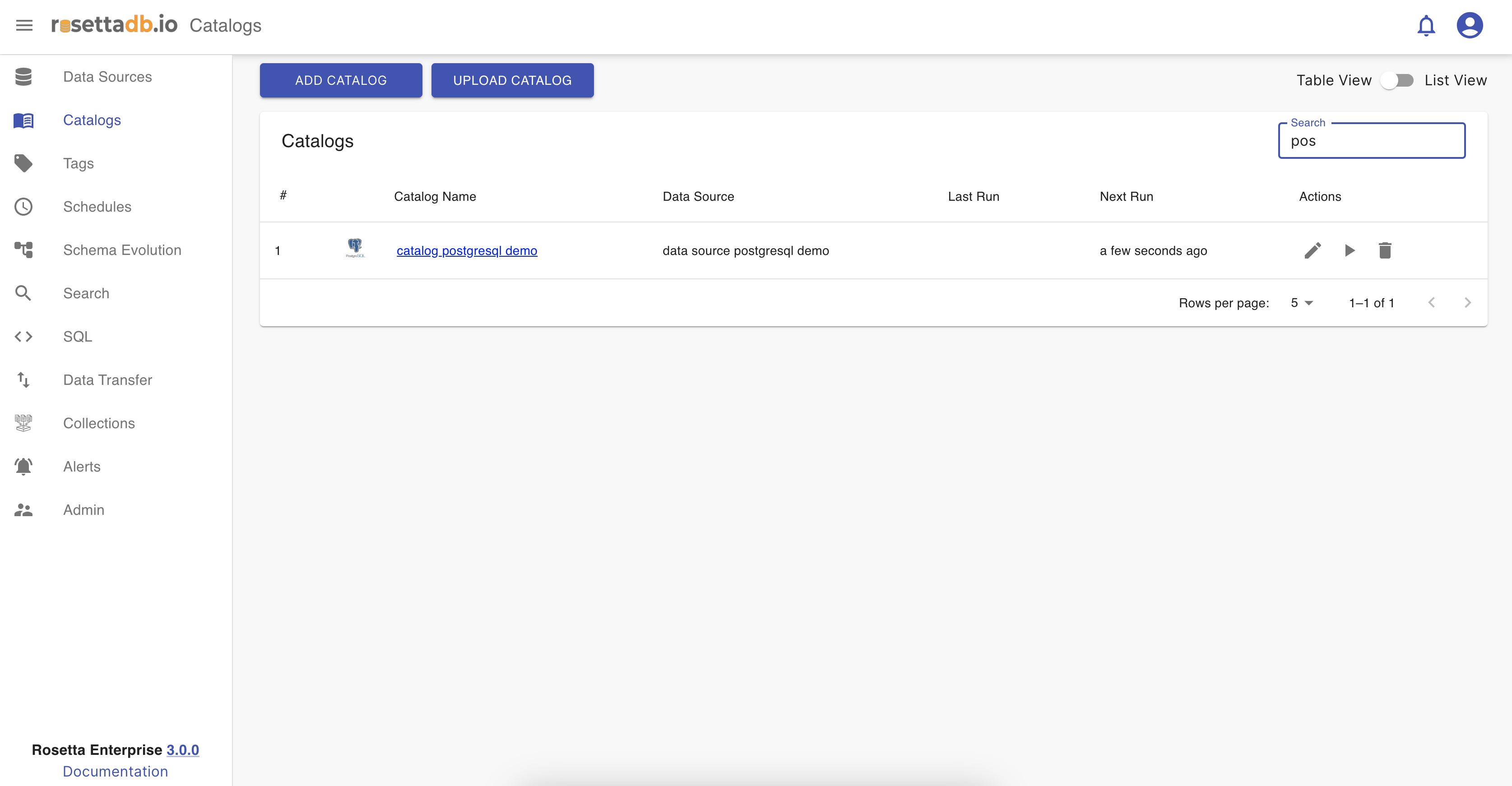 Now that one catalog is configured, on the Catalog tab the user can see a list of the catalogs and a button Add Catalog that redirects to the Catalogs screen for creating a new catalog. The catalog can be edited, deleted, ran and searched.