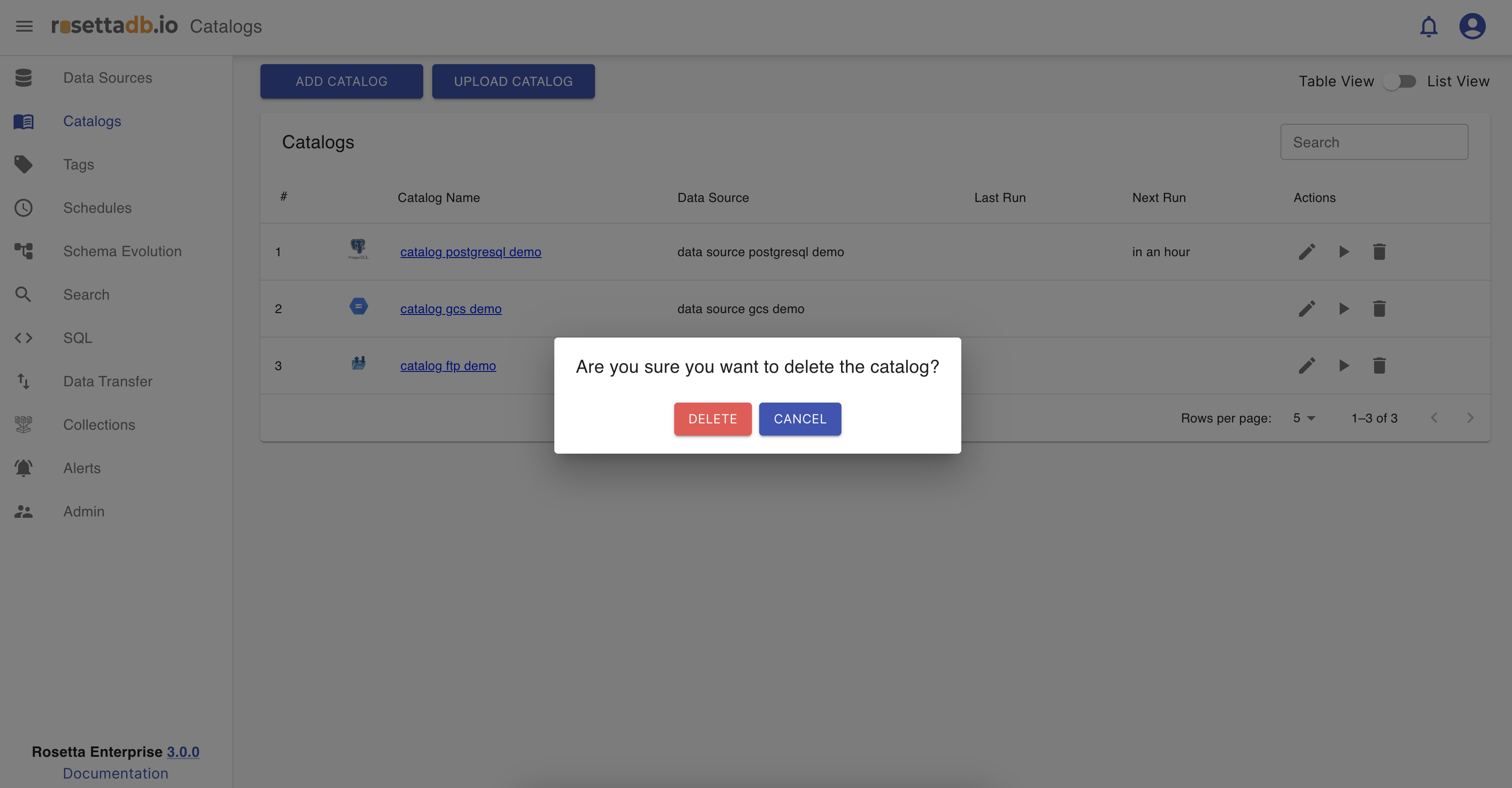 When the icon is clicked, a pop-up appears with a question if the user is sure about deleting the catalog, and if yes the user clicks Delete and if not clicks Cancel.