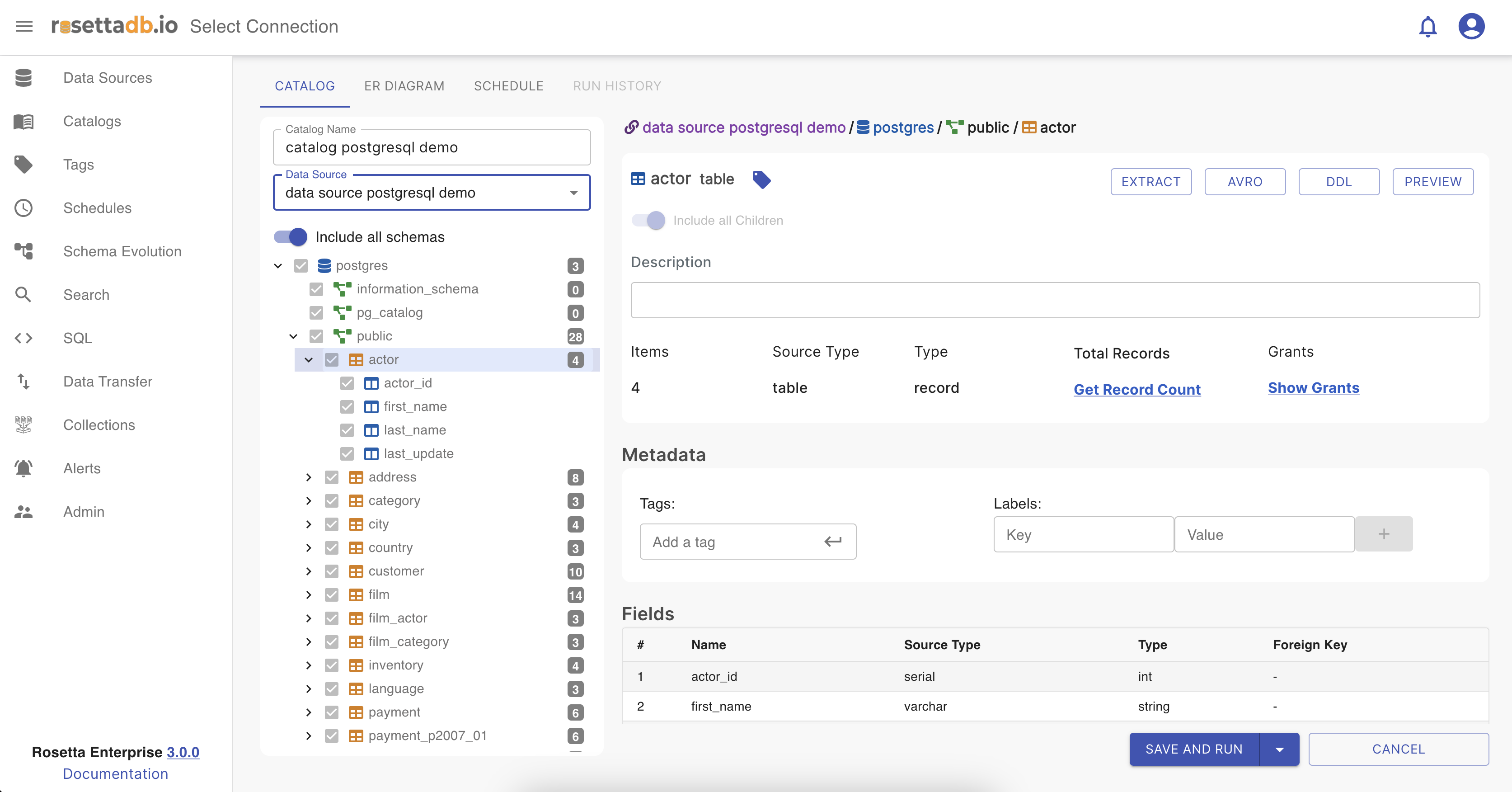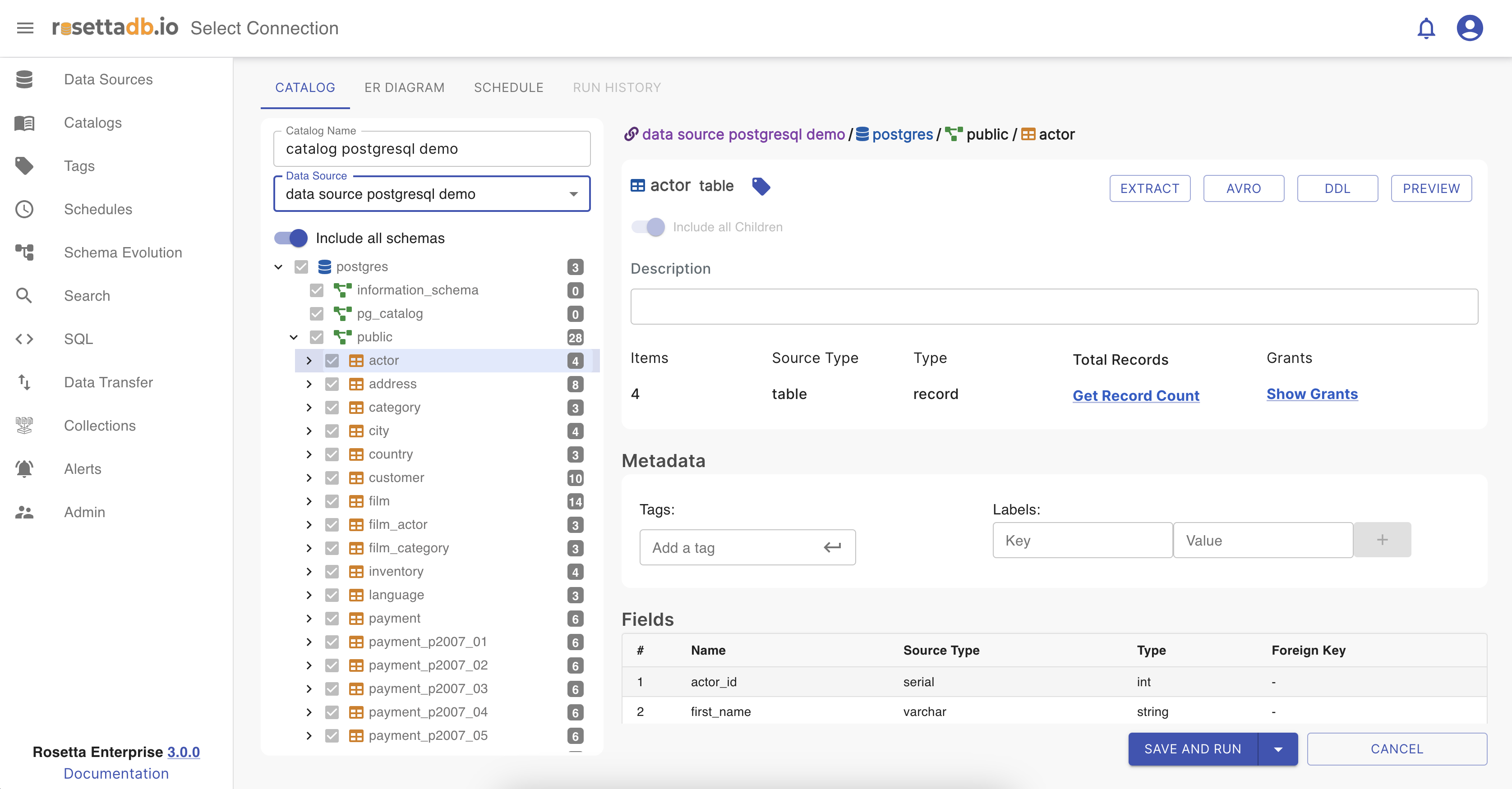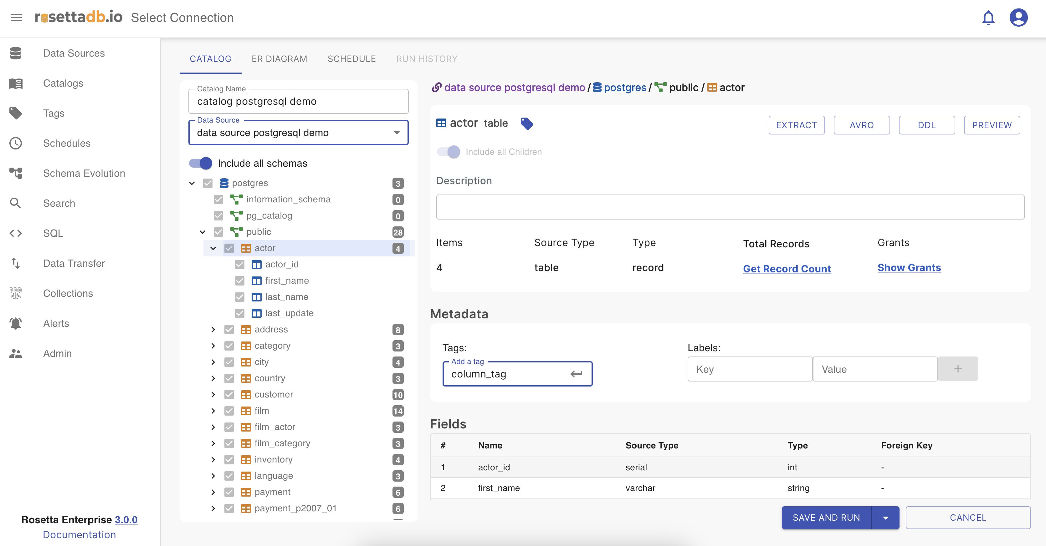 In Rosetta , the Catalog feature allows users to create catalogs based on the metadata of the data source. Catalog generation supports tagging and labeling functionalities. To create a new catalog, users must provide a unique name to prevent any potential issues and select a data source from existing sources or newly created ones. Additionally, there's a lazy loading aspect that fetches total record counts within the data source, which automatically runs every time a scheduled catalog is triggered.