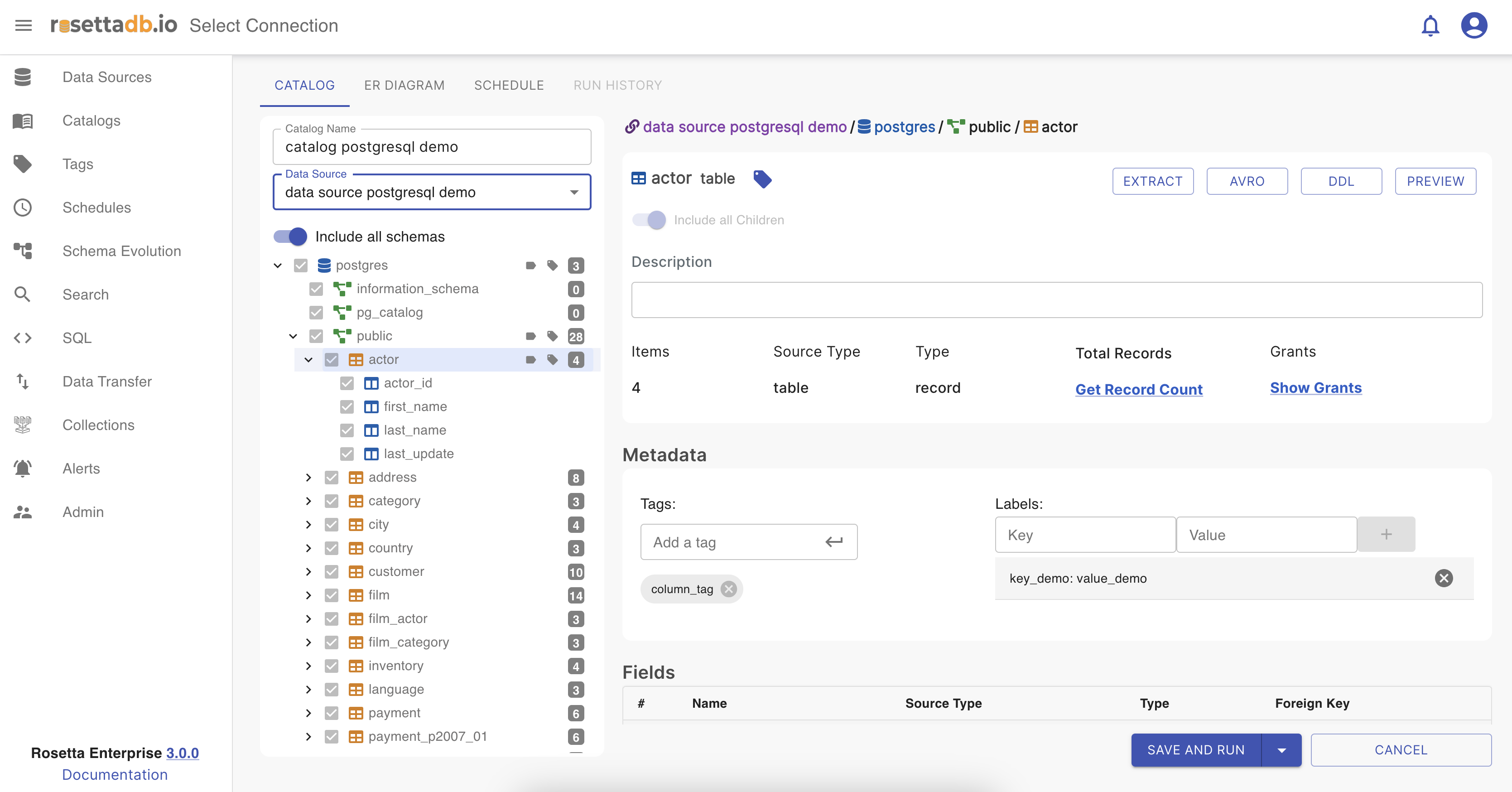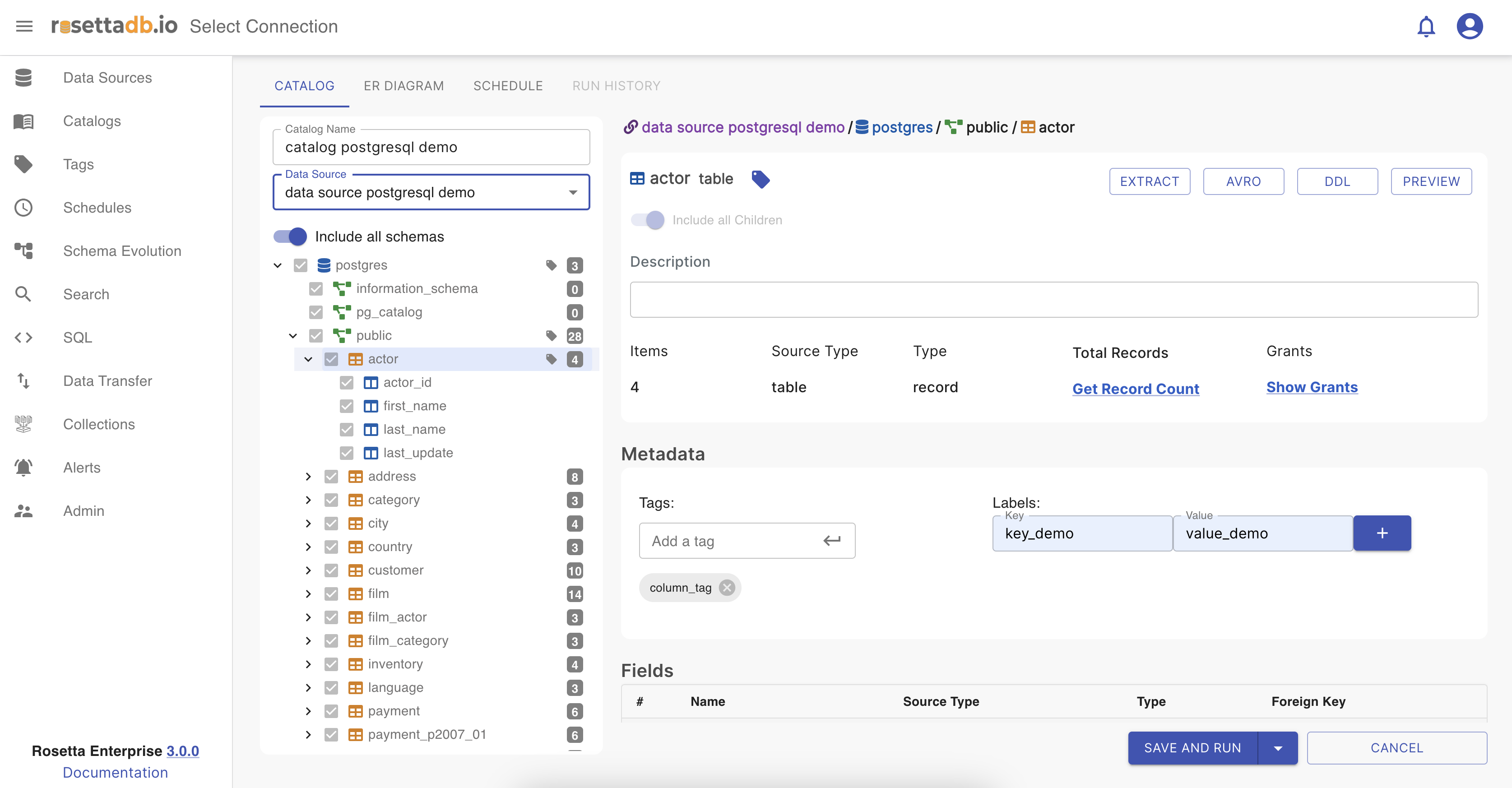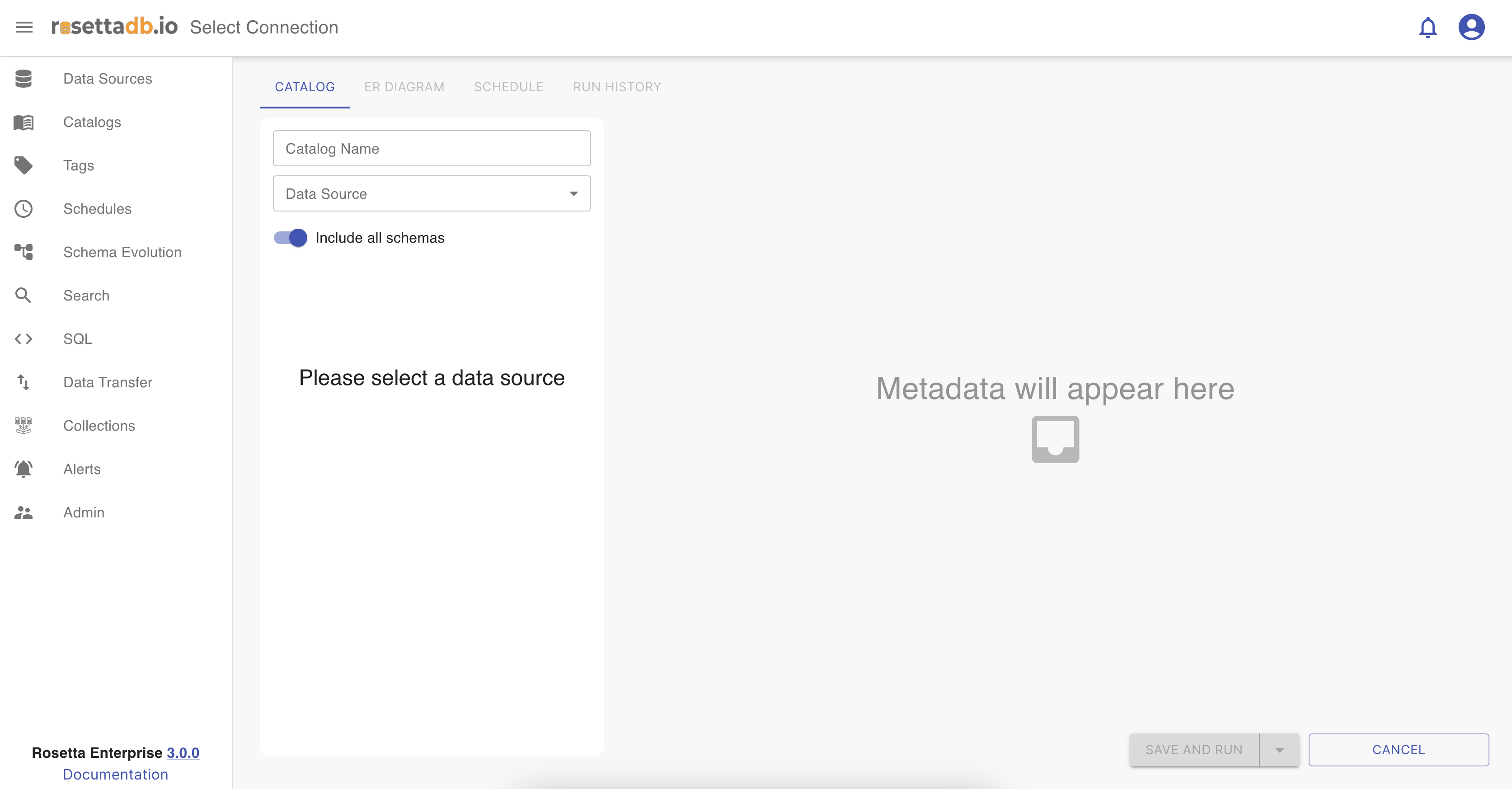 In Rosetta , the Catalog feature allows users to create catalogs based on the metadata of the data source. Catalog generation supports tagging and labeling functionalities. To create a new catalog, users must provide a unique name to prevent any potential issues and select a data source from existing sources or newly created ones. Additionally, there's a lazy loading aspect that fetches total record counts within the data source, which automatically runs every time a scheduled catalog is triggered.