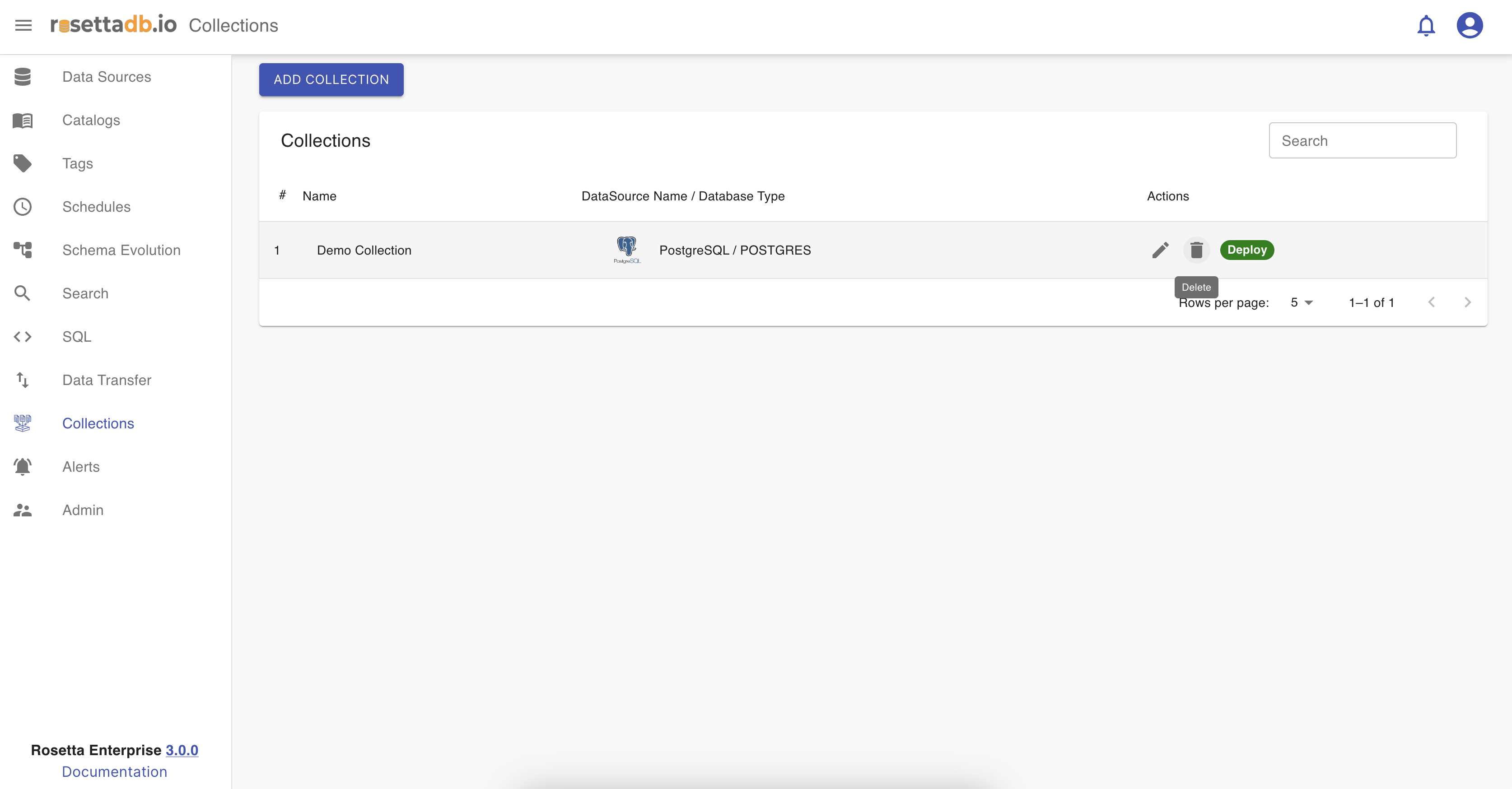 Now that a collection is configured, on Collection tab the user can see a list of the collections and a button Add Collection that redirects to the Collections screen for creating a new one. The collection can be edited, deleted, deployed and searched.