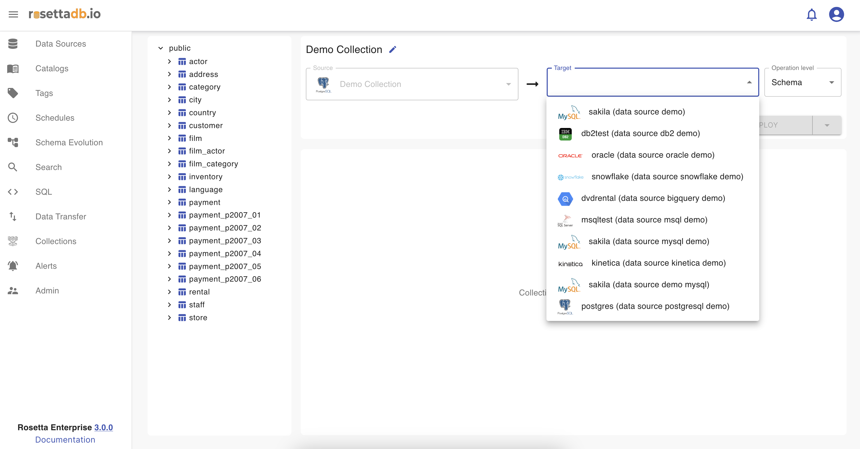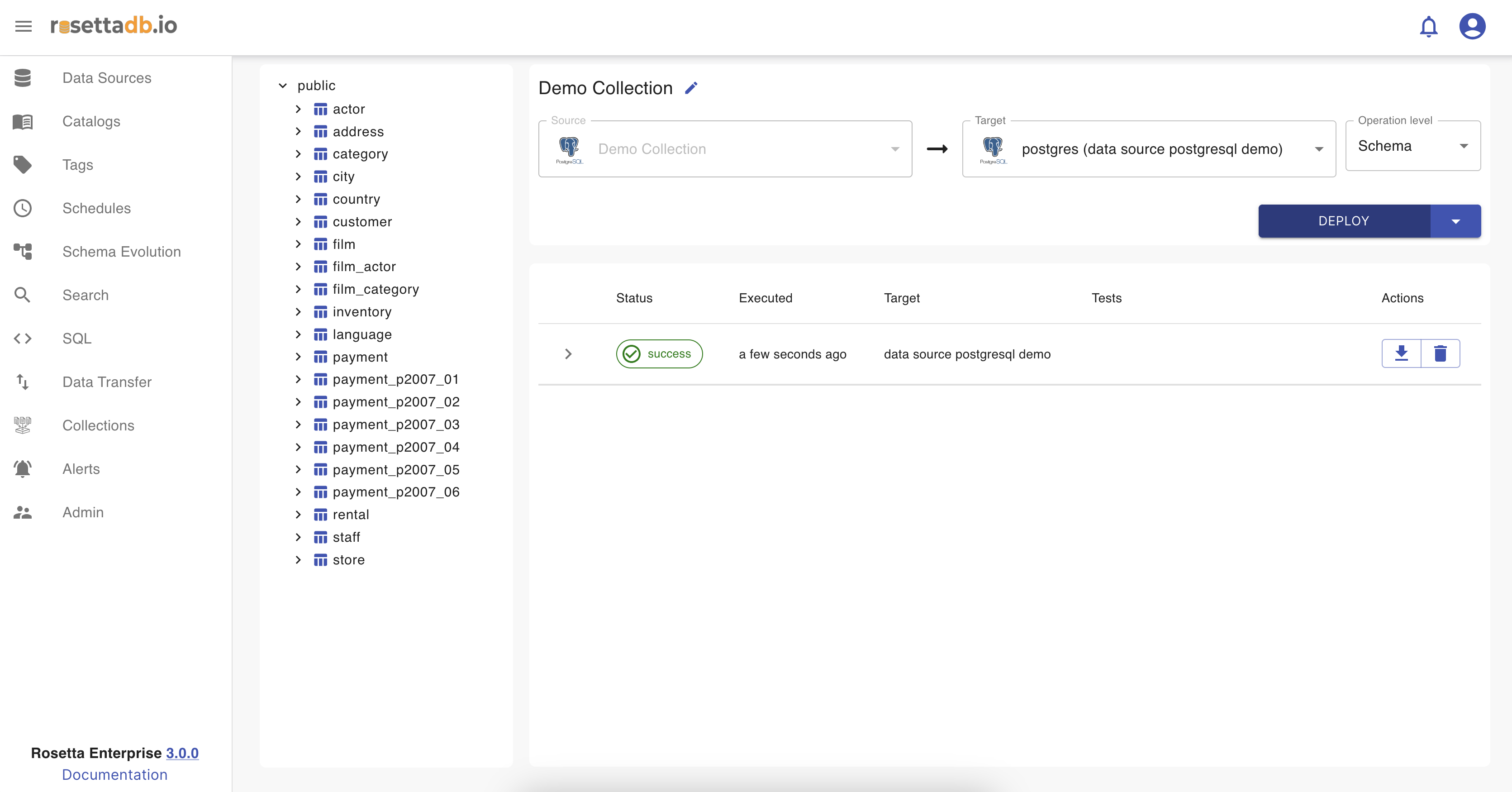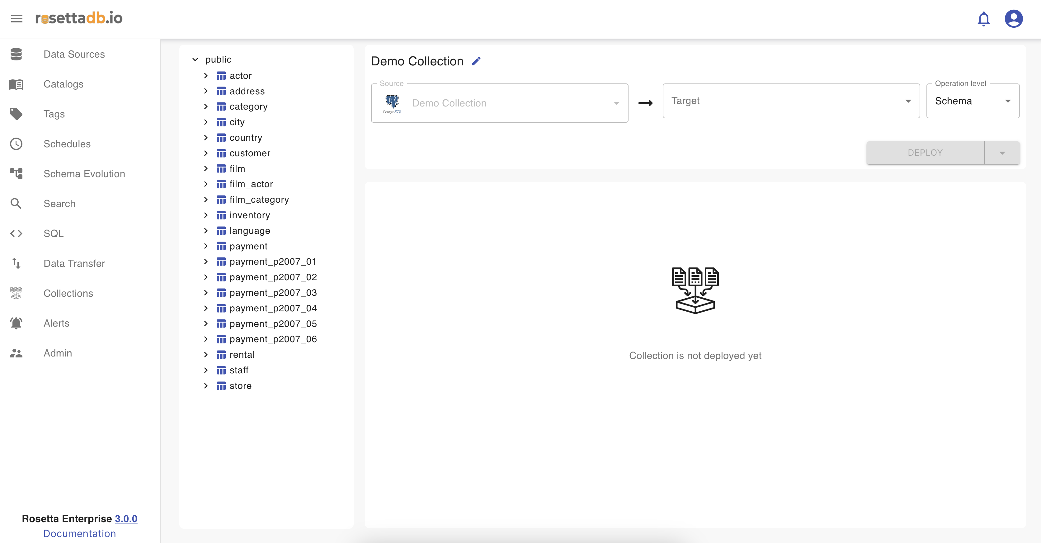 A new screen for Deployment is opened where the new schema is shown on the left of the screen, a collection that can be edited and a target DB which represents the location where the collection will be deployed. The user can choose from the list of data sources where to deploy the new collection.