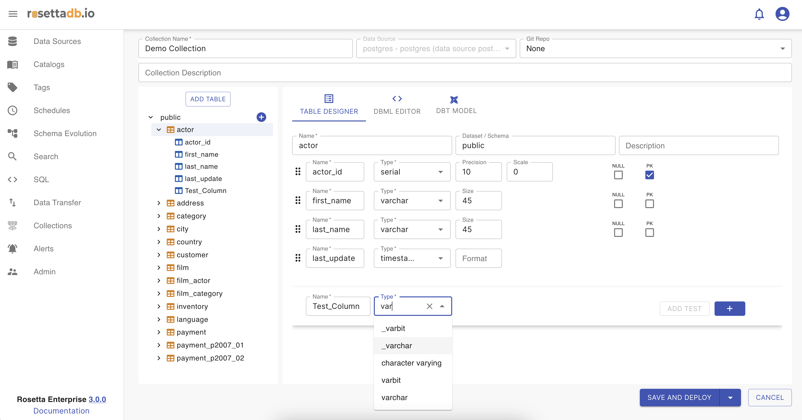 Collection is the category where the user can create a collection based on the existing data sources, or can create a new one from scratch. The data of the data source can be explored on table designer, it can change or also create completely new ones. The collection can be linked to a git repo.