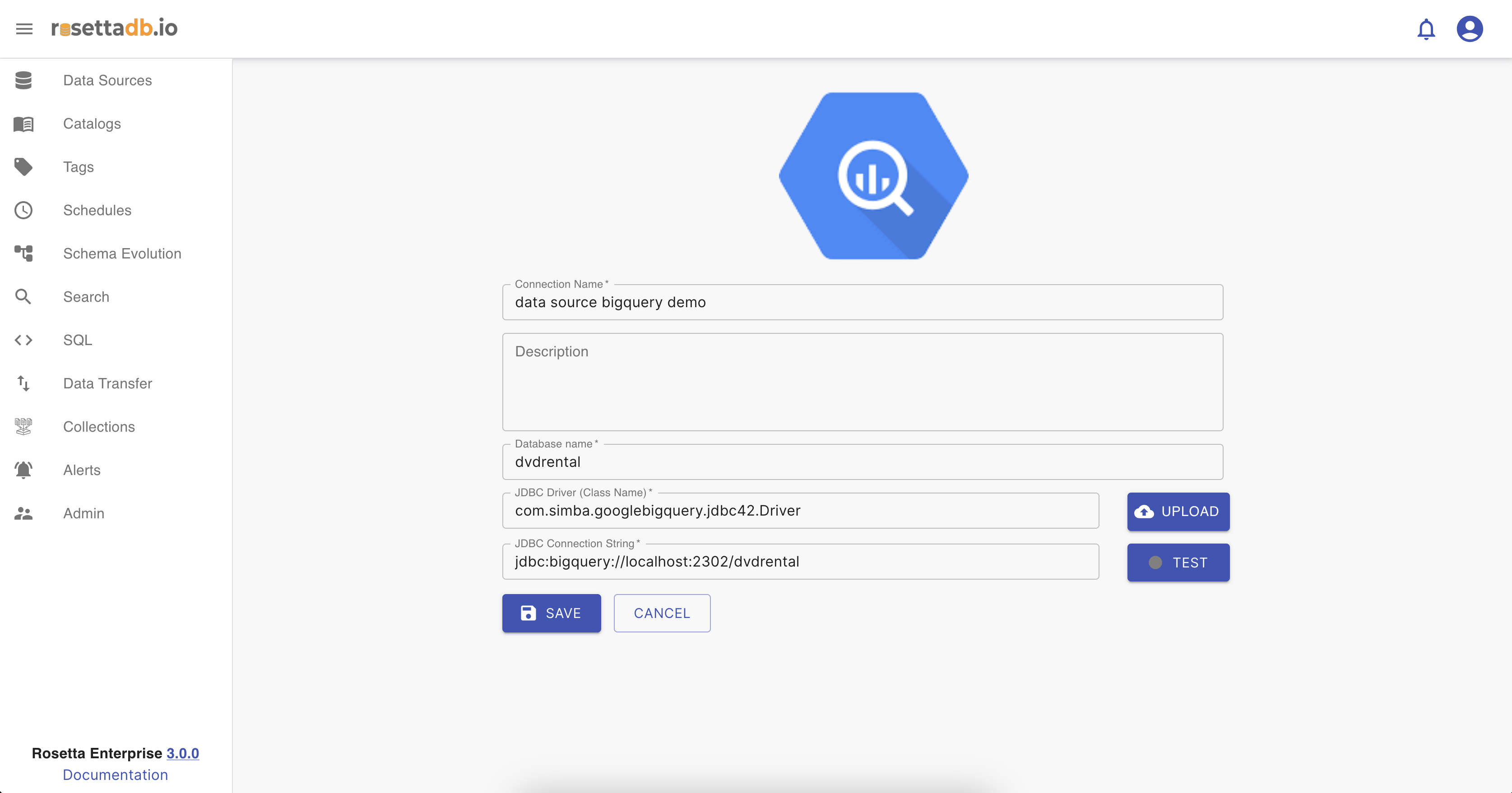 If the user chooses the BigQuery connection type, must fill in some fields such as the connection name that should be unique, a description, the database name, the driver that should be uploaded and the JDBC connection string should be given in a format jdbc:bigquery://{host}[:{port}][;databaseName={database}].