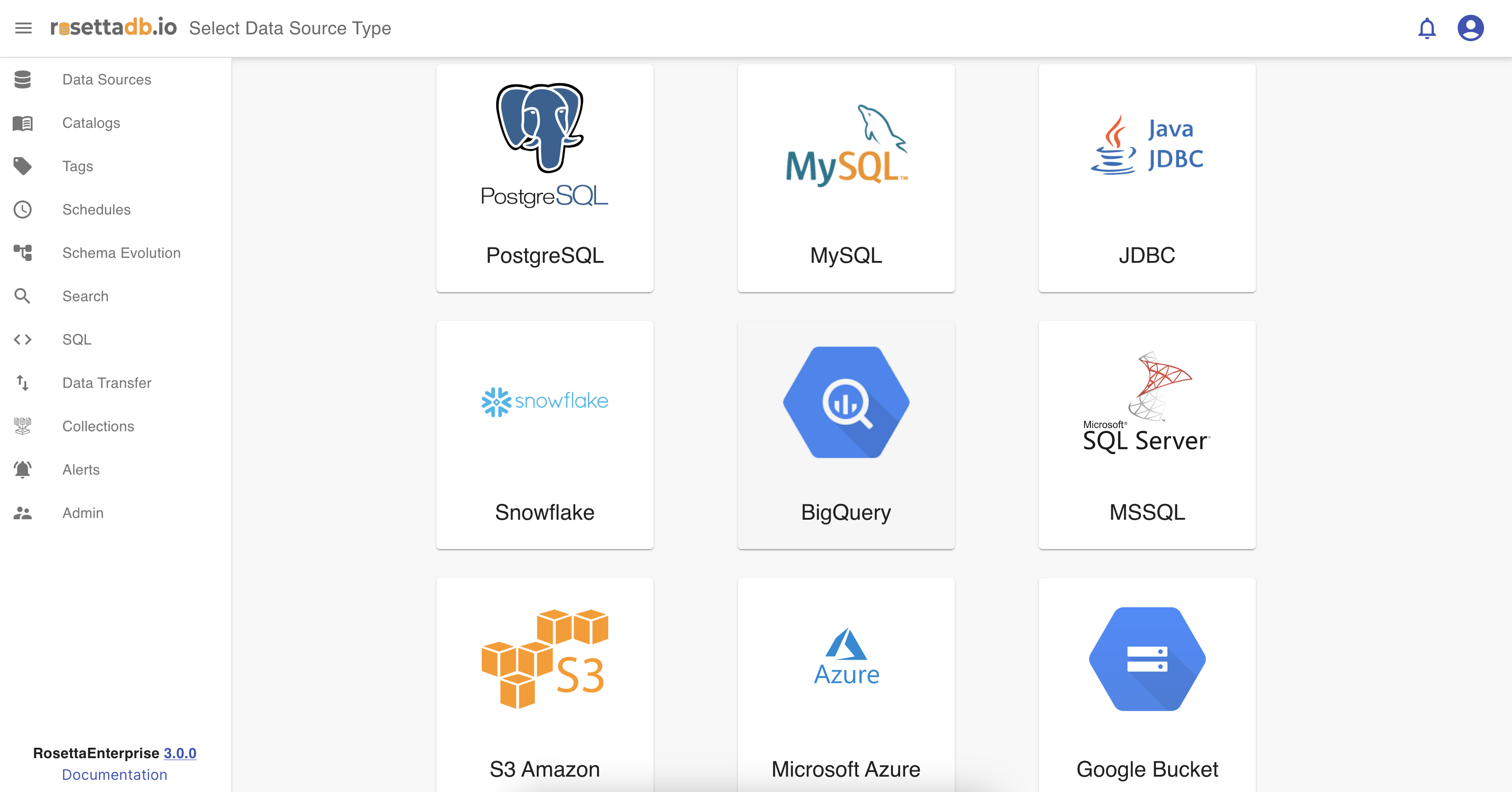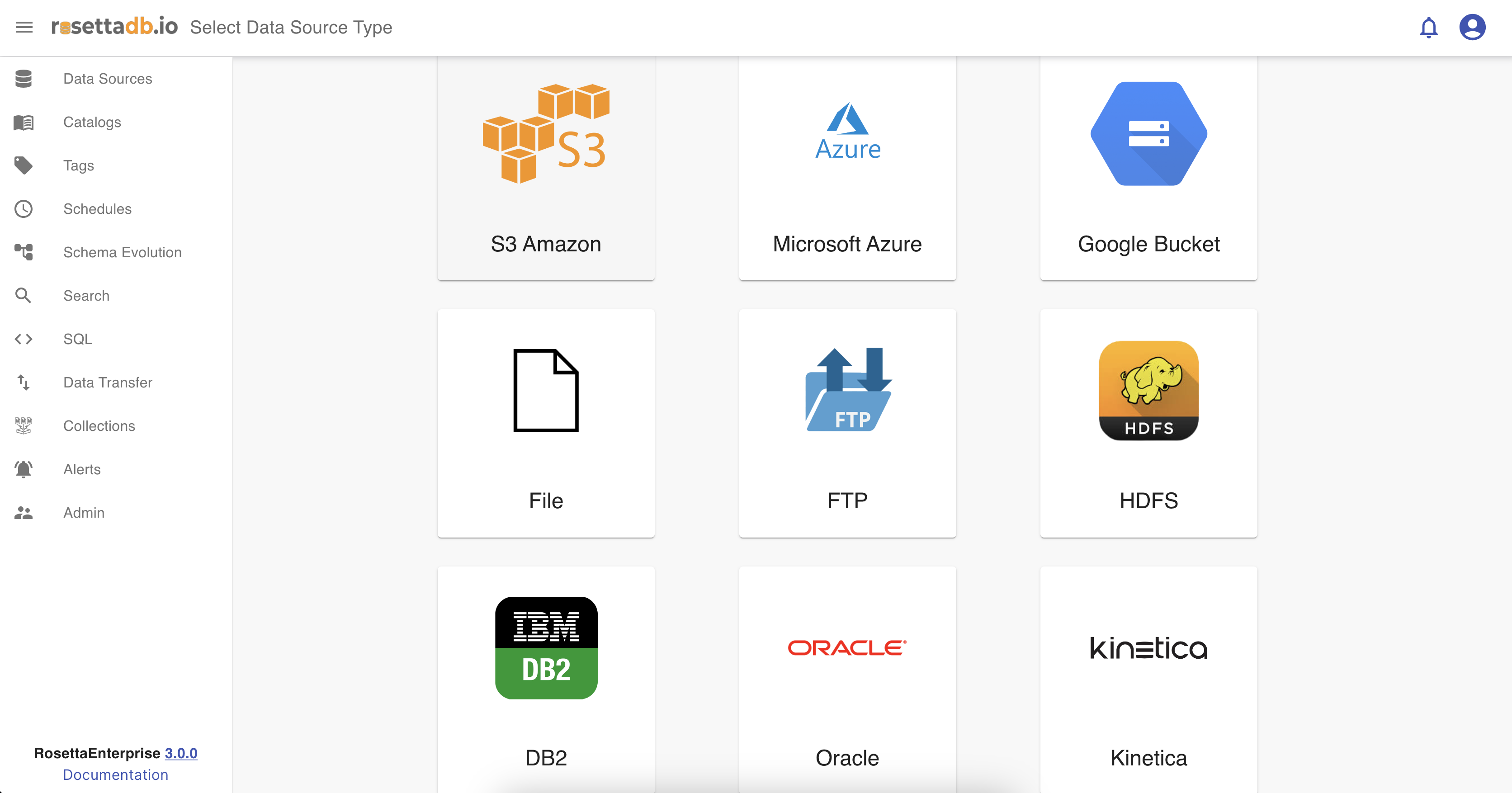 Data Sources category is where users establish and create connections to various data sources. Users have the flexibility to choose from fifteen options, including JDBC drivers, files, FTP, Google Cloud Storage (GCS), Amazon Simple Storage Service (Amazon S3), Microsoft Azure, HDFS, DB2, Oracle, Snowflake, BigQuery, MsSQL, PostgreSQL, MySQL, and Kinetica.