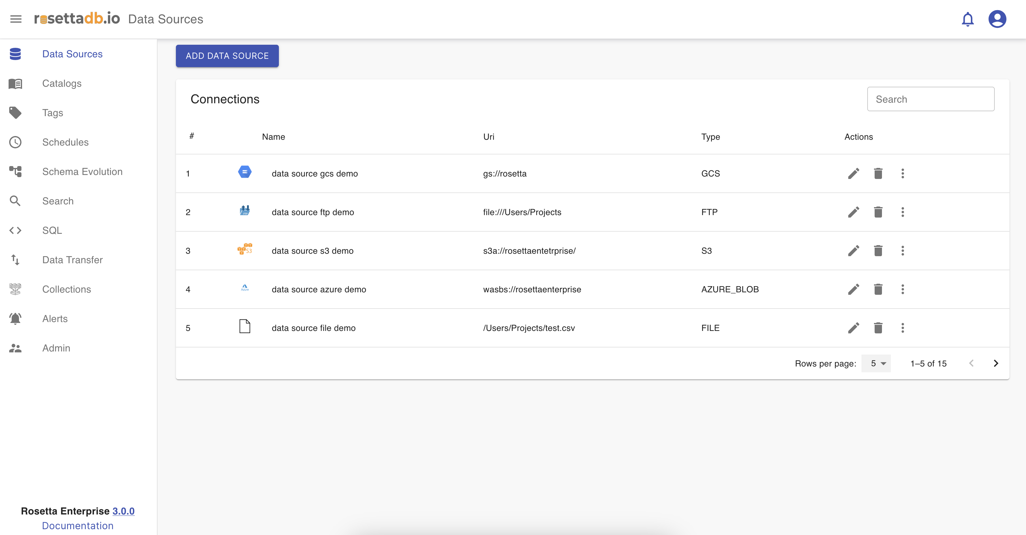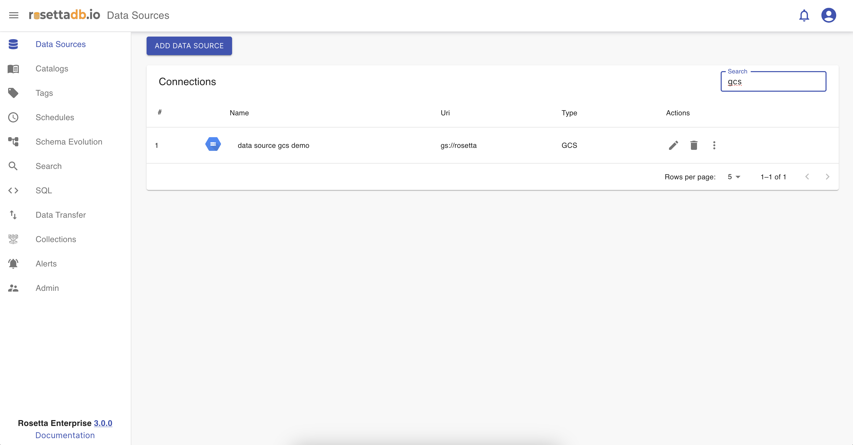 Now that one data source is configured, on the Data Source tab the user can see a list of the data sources and a button Add Data Source that redirects to the Data source screen for creating a new data source. The data source can be edited, deleted and searched.