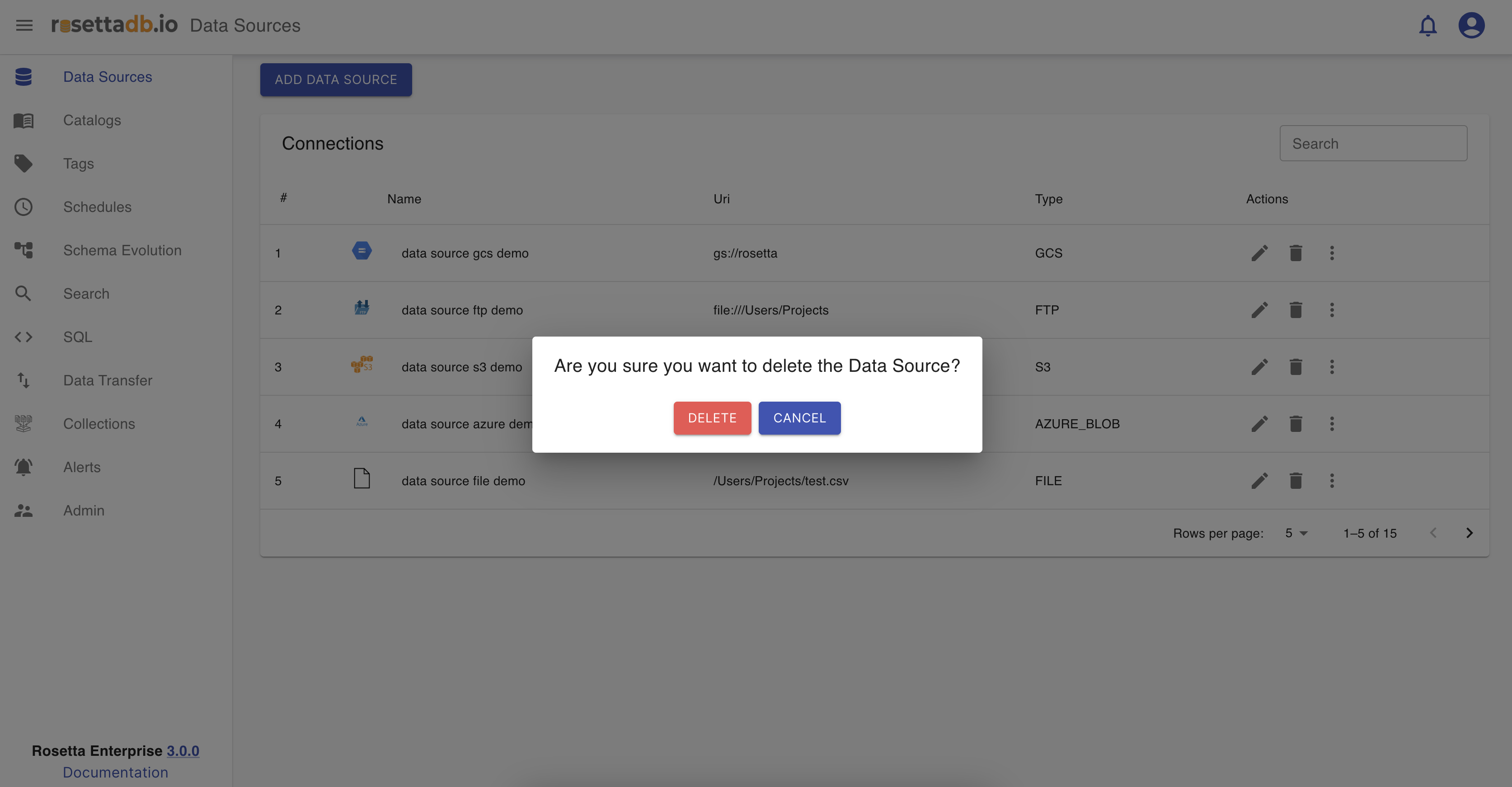 When the icon is clicked, a pop-up appears with a question if the user is sure about deleting the data source, and if yes the user clicks Delete and if not clicks Cancel.