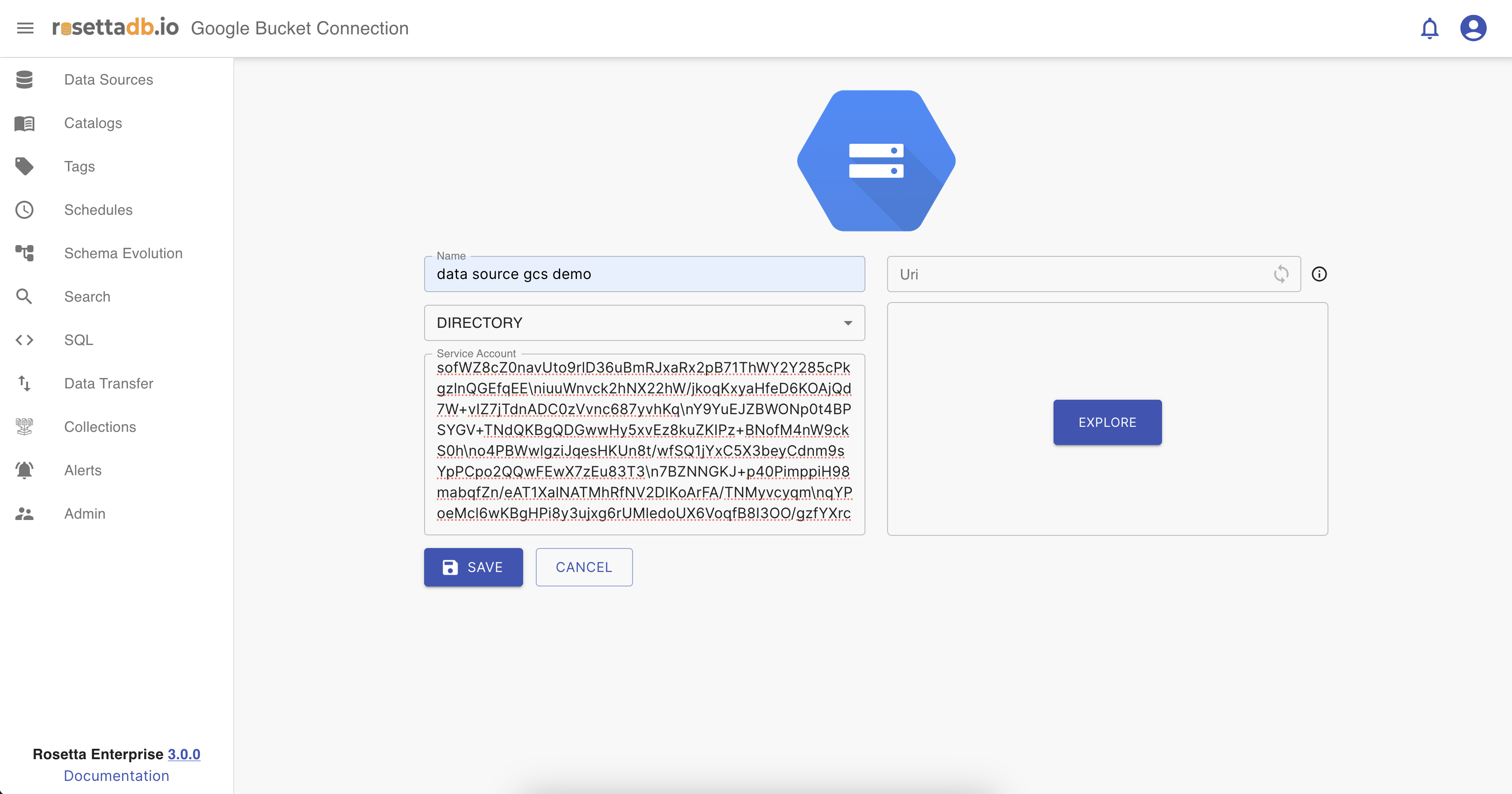 If the user chooses Google Bucket connection type the user needs to fill in a name, choose a type, a directory, CSV, Avro, or parquet, write the service account key, and fill in the URI of the file starting with gs://. The user can explore what files are inside the bucket by clicking on Explore, even without filling the URI . If it clicks on one of the files or directories of that bucket, the URI will be filled or rewritten automatically.