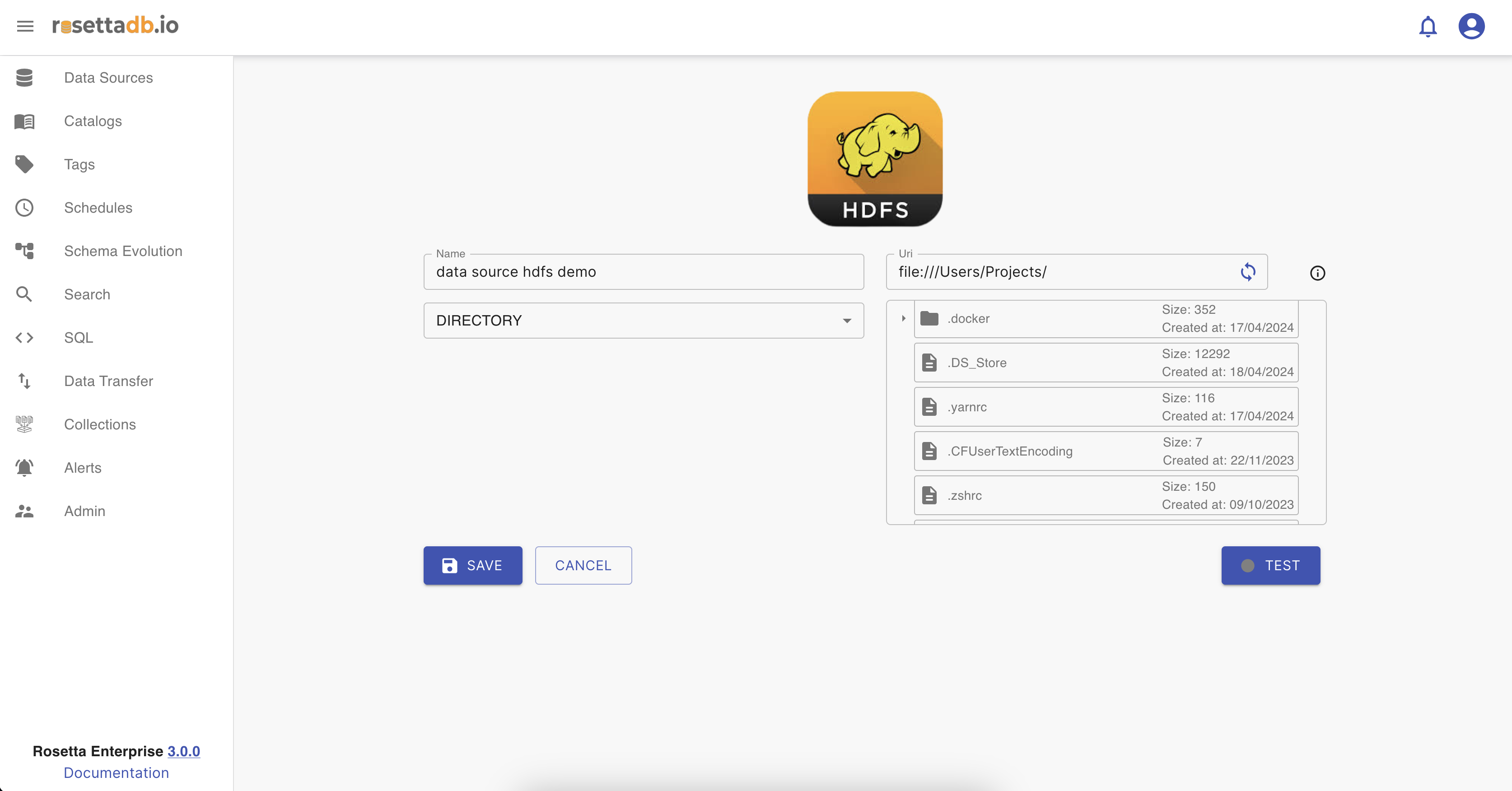 If the user chooses HDFS connection type it needs to fill in a name, choose a type, a directory, CSV, Avro, or parquet, and fill in the URI of the file starting with file://. In order to explore what files are inside the directory by clicking on Explore the user must specify the URI. If it clicks on one of the files in that directory, the URI will be reswritten automatically.