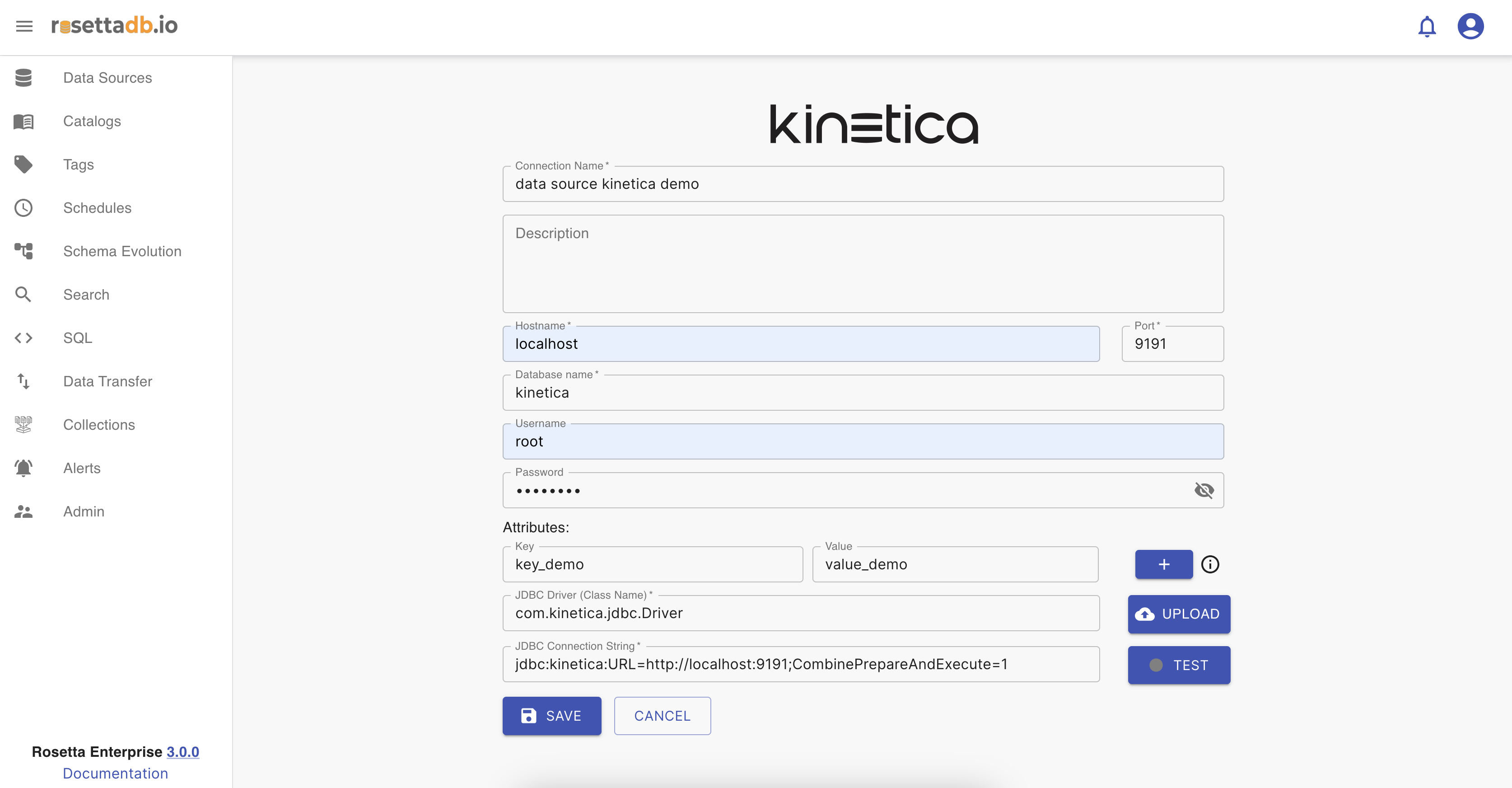 If the user chooses Kinetica connection type, must fill in some fields such as a connection name that should be unique, a description, hostname and port, a database name, configured username and password for the data source, attributes such as key-value pairs that can be added, the driver should be uploaded and connection string should be given in a format jdbc:kinetica:URL=http://${host}:${port}.