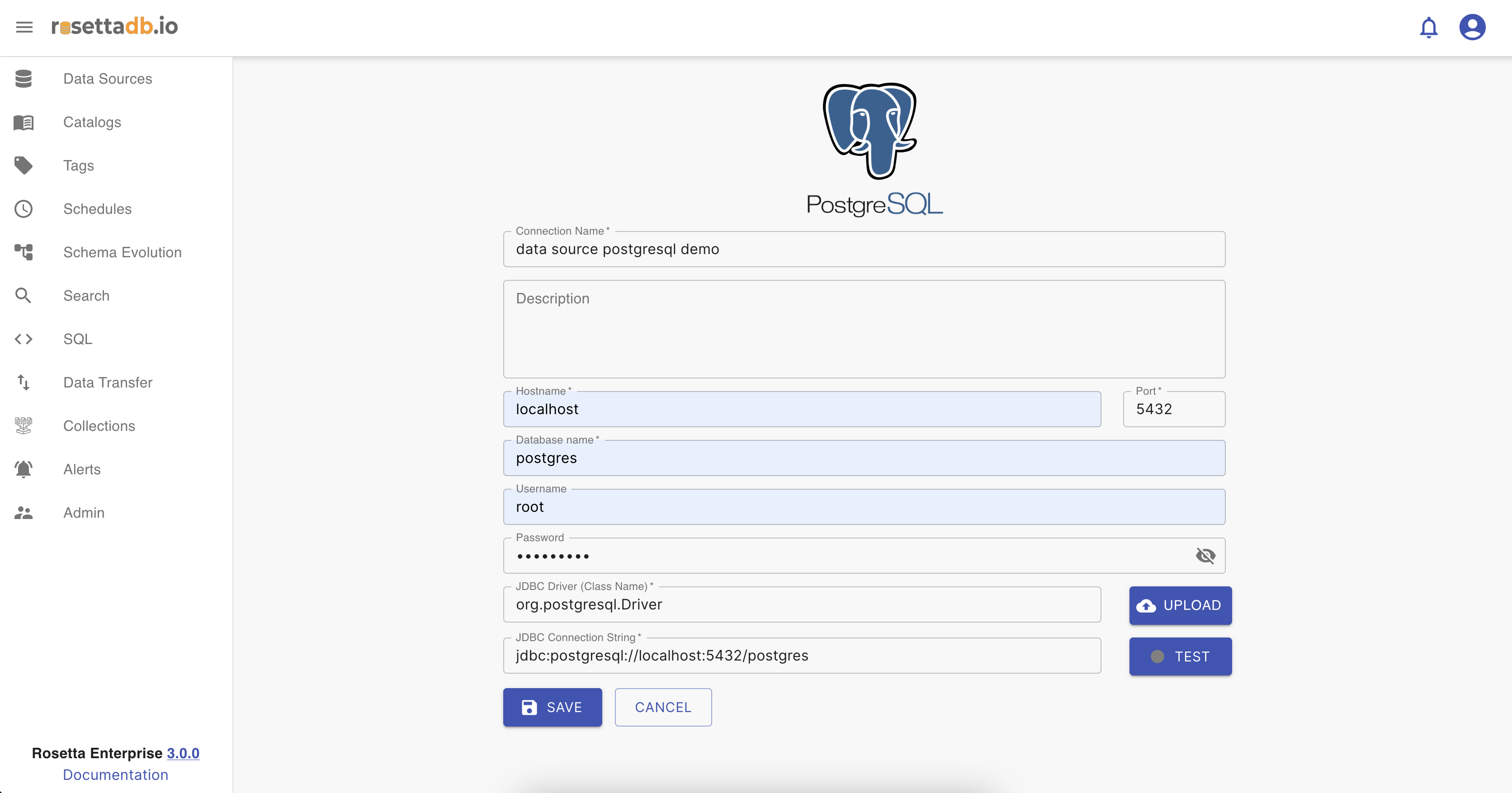 If the user chooses PostgreSQL connection type, must fill in some fields such as the connection name that should be unique, a description, hostname, and port, configured username and password for the data source, the driver should be uploaded and the connection string should be given in a format jdbc:postgresql://${host}:${port}.
