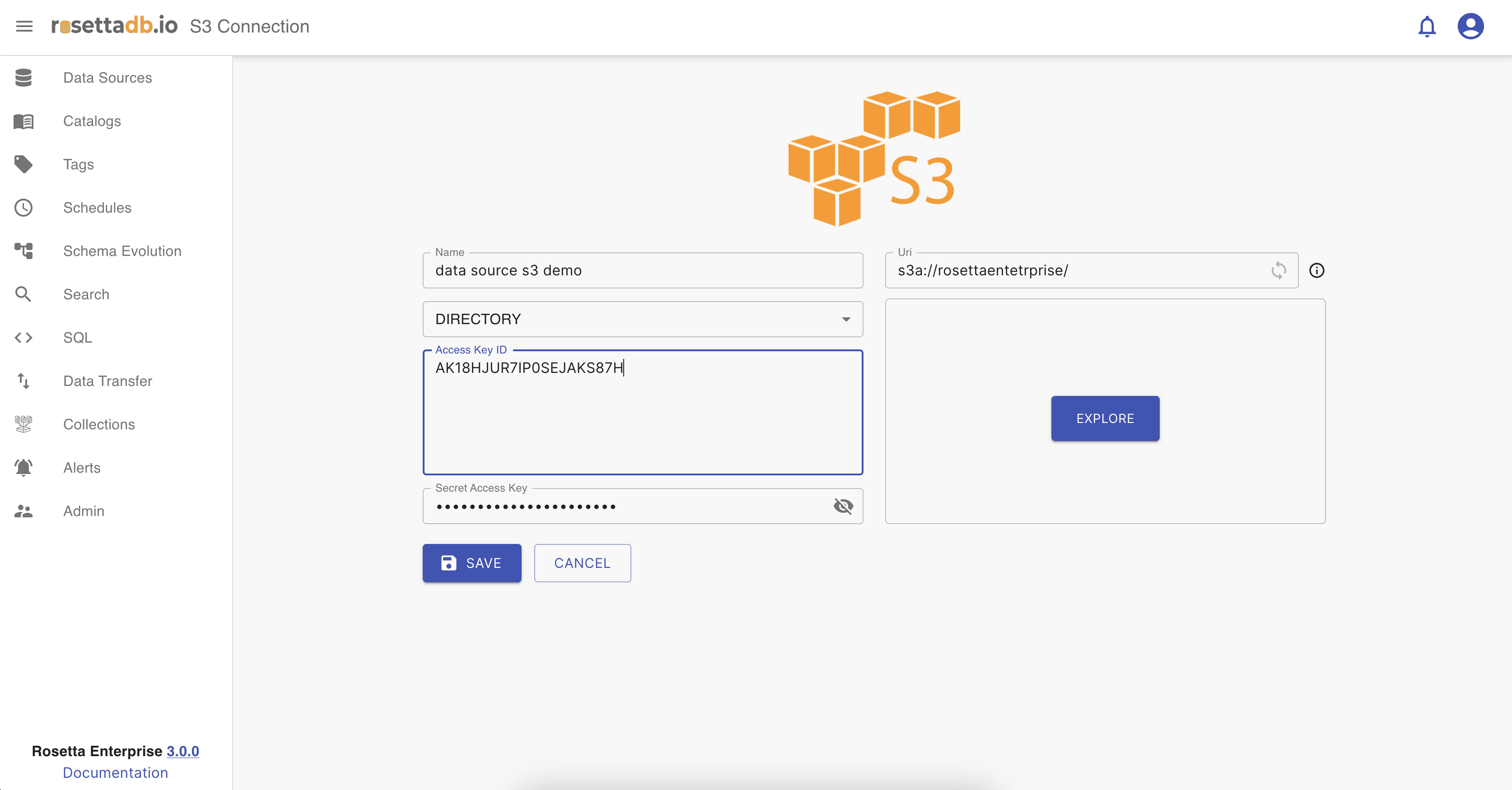 If the user chooses S3 Amazon connection type the user needs to fill in a name, choose a schema type of the file, CSV, Avro, or parquet, provide access key ID and secret access key, and fill in the URI of the file starting with s3a://. The user can explore what files are inside the bucket by clicking on Explore, even without filling in the URI. If it clicks on one of the files or directories of that bucket, the URI will be filled or rewritten automatically.
