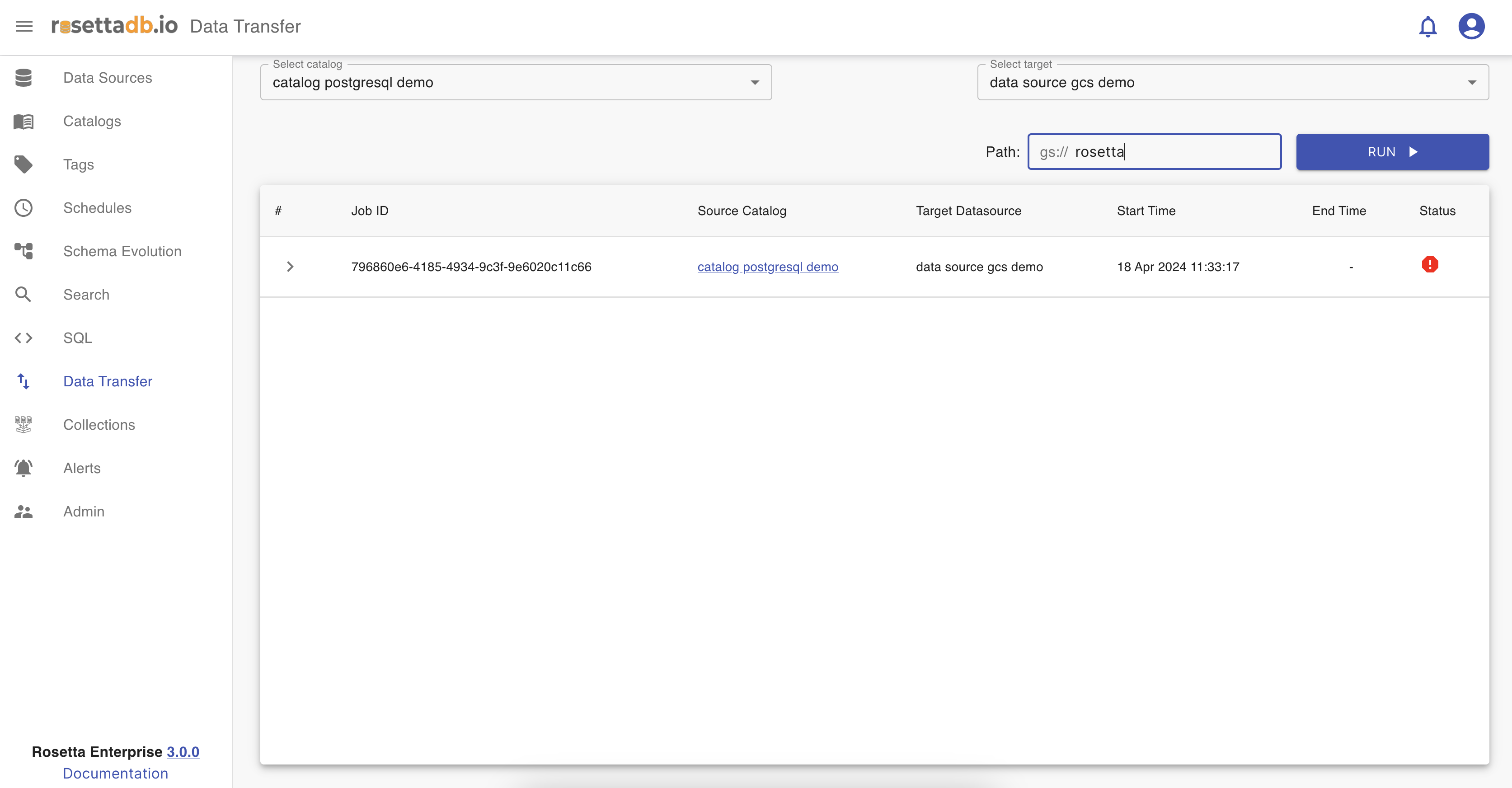 Data transfer is the category where users can initiate the transfer of data from a created catalog to a Google Storage Bucket or Amazon Simple Storage Service (Amazon S3) data source.